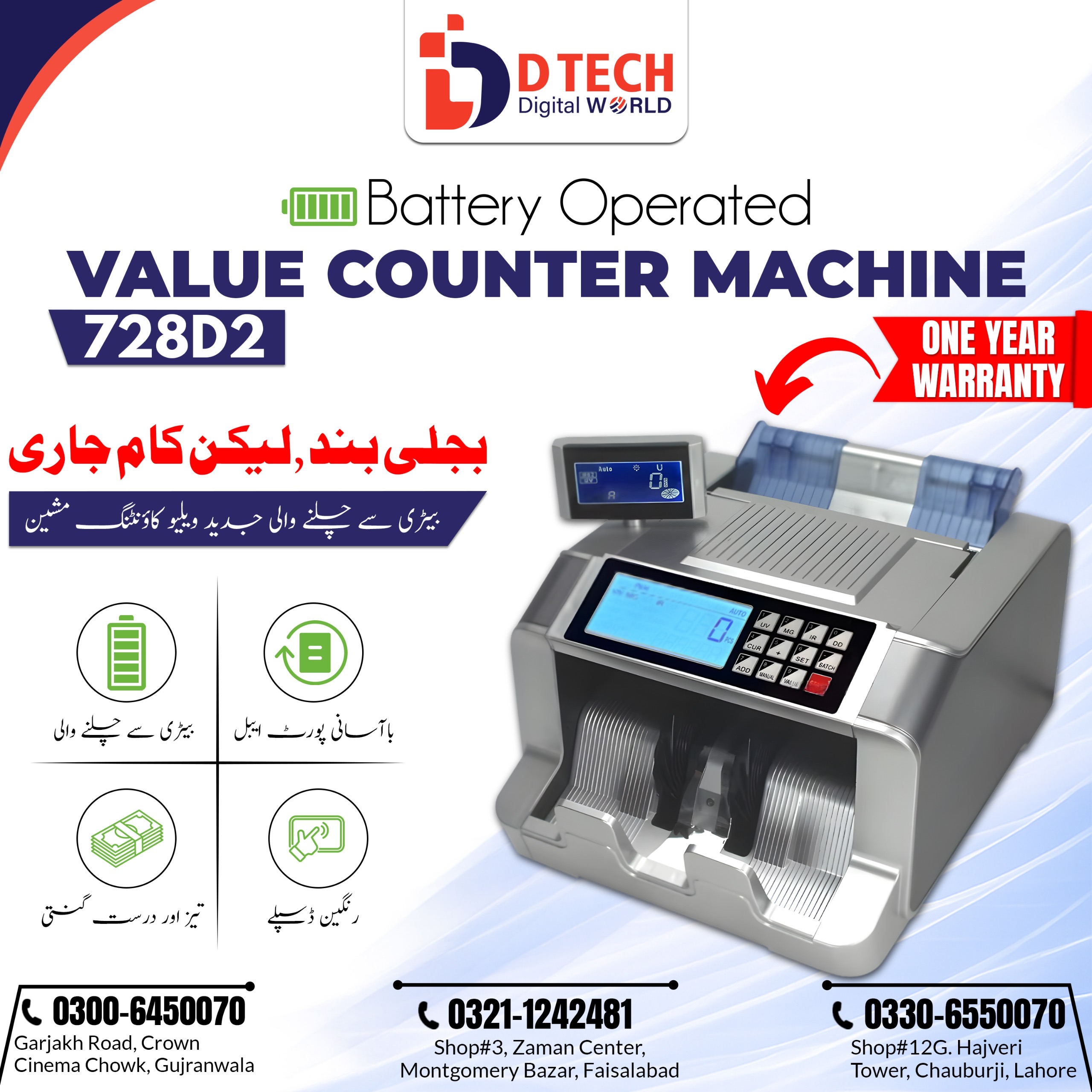 A cash counting machine with a built-in fake note detection system is an essential tool for businesses that handle large volumes of cash daily and its battery operated . This machine is designed to count banknotes quickly, accurately, and efficiently, saving time and reducing human error. Equipped with advanced detection technologies such as UV (Ultraviolet), MG (Magnetic), and IR (Infrared), it ensures that counterfeit or suspicious notes are instantly identified during the counting process.